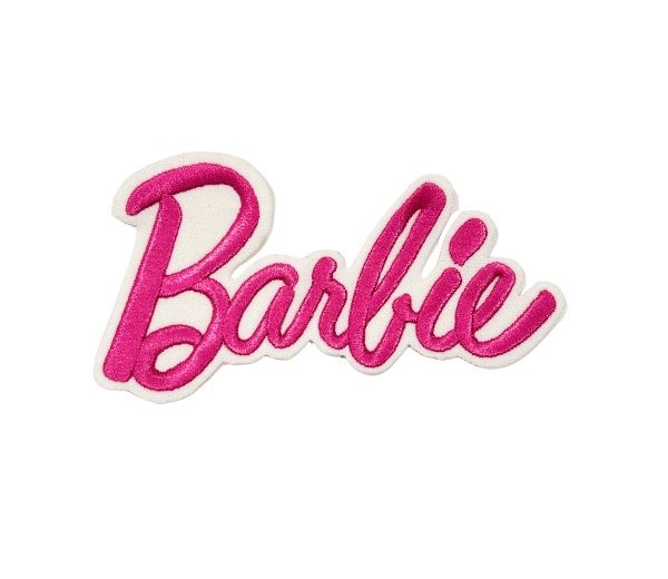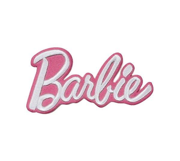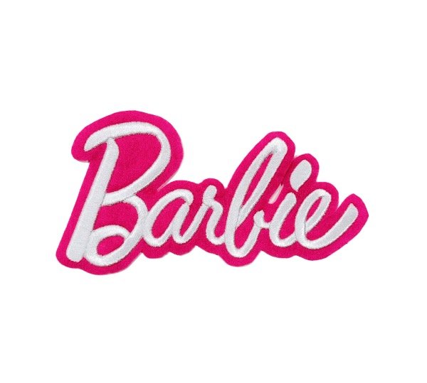 Parche bordado de alta definición con lettering estilo Barbie en colores vibrantes.
